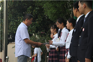 习近平总书记曾说过:“爱国主义自古就流淌在中华民族血脉之中,去不掉,打不破,灭不了,是中国人民和中华民族维护独立和民族尊严的强大精神动力。”壮丽70年,奋斗新时代,多少英雄模范以血肉之躯赴民族之荣,多少时代先锋以才能实干建设国家!这个暑假,我们学生会干部与骨干团员一起感受榜样力量,寻访先锋模范故事。在国旗的引领下,寻找身边曾经为社会主义革命和建设事业作出贡献、有影响力的先进英模,用我们视野还原他们的奋斗故事。今年暑期,在校团委陈伊萍老师的带领下,我校学生会副主席黄若琦同学、新闻部部长沈艺雯同学、文体部副部长钱蔚妮同学、宣传部部长李明乂同学、校刊部部长范星韵同学、电视台台长吴文博同学以及高三年级团员代表贺仕佶同学寻访对话革命老干部,将他们的故事编写成《追寻徐汇印记 寻访模范故事》手册。在仪式上,校党委副书记马强老师为他们颁发纪念证书。