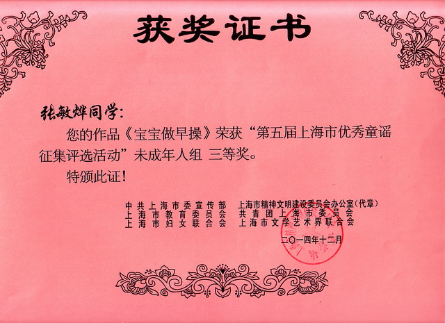 第五届上海市优秀童谣征集评选活动三等奖张敏烨《宝宝做早操》