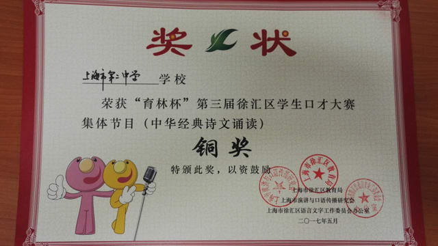 “育林杯”第三届徐汇区学生口才大赛集体节目中华经典诗文诵读铜奖2017.5