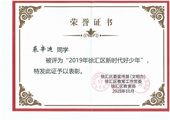热烈祝贺裘辛迪同学被评为2019年徐汇区新时代好少年