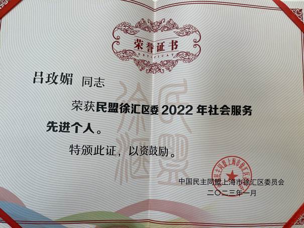 吕玫媚老师被评为2022年民盟徐汇区委社会服务先进个人
