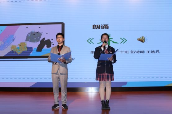 第二个节目是高一10班的伍诗晴、王逸帆带来的诗朗诵《春》,两人的朗诵铿锵有力,给人一种如沐春风之感。