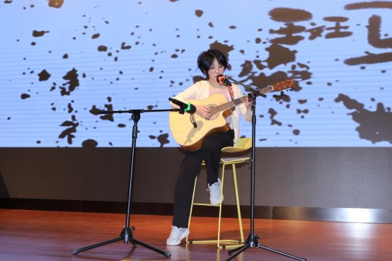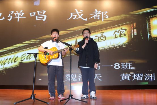第五个节目是来自高一8班崔雪菲、魏浩天、黄熠洲的吉他弹唱,演唱者优美的歌喉与动听的吉他声获得了同学们的一致好评。