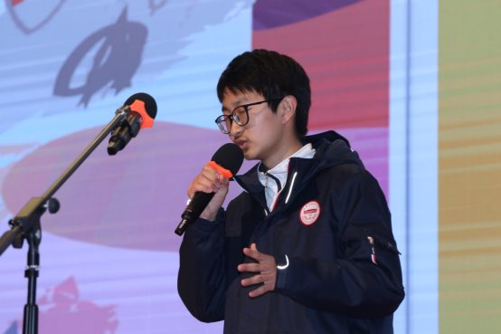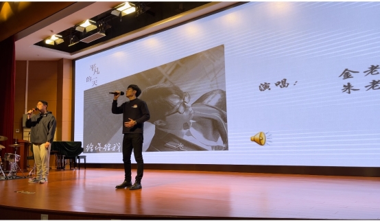 最后的节目是同学们最为期待的教师表演,在全场欢呼和掌声中,教师代表朱亮全老师和金禛皓老师隆重登场,他们带来一首歌曲《给你给我》,歌声交错着神奇、优雅、飘渺的音符,让台下观众一起欢呼。