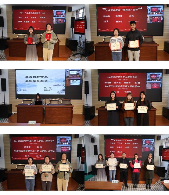 同时,获得“2022学年育人奖朱熠韡老师、陈海燕老师、施嘉华老师、蔡蕾老师荣获“2022学年青年育人奖”称号的赵琦老师、钱蔚玲老师他们用爱心润物无声,用点石成金的力量,将学生的潜能激发出来,浇灌他们茁壮成长。他们不仅是在教育领域里的耕耘者和忘我者,更是学校的耀眼明星。陈樱樱老师、郭倩老师荣获“育人(提名奖)”称号,张乐老师、赵艳老师荣获“2022学年青年育人(提名奖)称号。陆军校长、吴卫副校长、政教主任李拥军老师、教导副主任许敏老师分别在两个校区获奖教师颁奖。